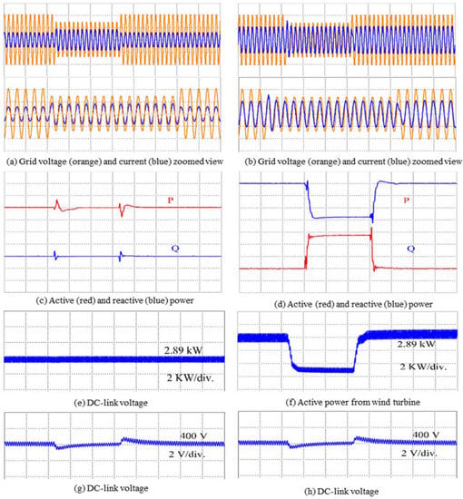 A reduction in active power production is not possible, since the wind turbine system is unaware of the grid voltage sag, as shown in Figure 17e. Thus, undesired active power production continues, which further indicates the need to make use of the additional protection circuits to safeguard the PMSG-based WPCS under grid fault conditions. Note that the grid voltage and current are in-phase indicative of real power generation, even under faulty grid conditions, which is not desirable. Unsafe inverter operation can also take place, which may damage the inverter switches due overcurrents in the event of severe grid fault conditions, owing to the lack of control over the injected grid current. With the employment of the proposed LVRT strategy, a smooth reactive power injection is possible during grid fault (Figure 17d), and a constant lagging current can be easily injected to the grid, as depicted in Figure 17b. The active power production from the wind turbine can also be easily controlled with the incorporation of the proposed smart LVRT approach, as shown in Figure 17f. Furthermore, the WPCS manages to avoid overcurrent from the inverter and maintain the DC-link voltage value at its nominal value as desired (Figure 17g,h). Finally, once the voltage sag is cleared, the WPCS resumes normal operating behavior and attempts to track the maximum active output power from the wind turbine by delivering reference active power with no reactive power delivery.