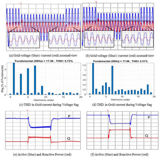 The LVRT controller is re-evaluated using the observer-based PLL and the proposed ILP-PLL, as shown in Figure 18. The grid voltage experiences 0.3 p.u. of voltage sag, as shown in Figure 18a,b. The proposed control strategy is applied to maintain a constant current before and after the fault conditions. Under nominal operating conditions, the harmonic distortions in the grid current are below 3%, as per the grid standard for both the observer-based approach and the proposed ILP-PLL approach. Figure 18c infers that the observer-based technique is sensitive to the presence of harmonics; as a result,  THD is observed under fault conditions. Unlike the observer-based PLL approach, the control approach comprising the proposed ILP-PLL can still maintain a total harmonics distortion (THD) level below the recommended value, i.e., 2.74%. Notably, power delivery operation to the grid is offered by both schemes in the event of grid voltage sag, as exemplified in Figure 18e,f. However, due to the increase in the THD of the grid current, the observer-based control approach is unable to correctly inject the required amount of reactive power into the grid as compared to the proposed control scheme. Hence, the proposed control solution offers a dynamically preferrable solution to enhance the fault ride through the capability of the small PMSG-based WPCS.