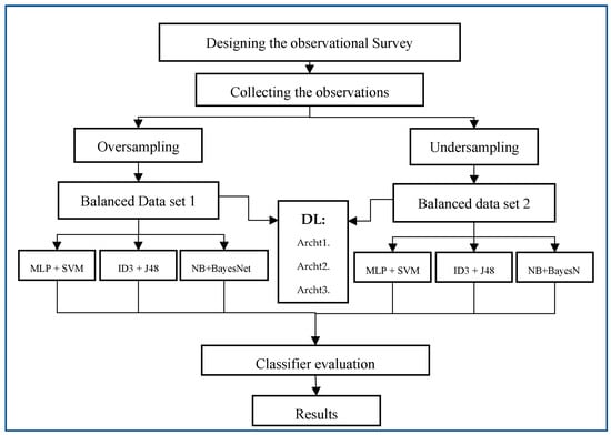 Therefore, any attempt to apply classification techniques to traffic-related data must first address the issue of imbalance, inherent in this type of data. This paper evaluates two significant techniques for handling an imbalanced dataset for drivers’ phone use in Jordan. These techniques are undersampling and oversampling. Data used in this paper were collected via a direct observational survey, covering a set of characteristics associated with three main safety aspects: humans, vehicles, and roadways []. The effectiveness of each technique was evaluated by applying six ML methods and three DL architectures on the balanced data. The ML techniques are Multilayer Perceptron (MLP), Support Vector Machine (SVM), Decision Tree (ID3), Decision Tree (J48), Bayesian Network (BayesNet), and Naive Bayes (NB). The DL architecture are: Archt1 (5 hidden dense layers), Archt2 (10 hidden dense layers), and Archt3 (15 hidden dense layers).