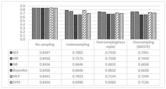 The performance of ID3, J48, NB, BayesNet, MLP, and SVM on the undersampled and oversampled data is presented in Table 5. The total accuracy was computed for each model. The recall, precision, and FPR were also computed for each class. As can be noted from Table 5, the ID3, J48, and MLP methods outperformed the other methods in all scenarios. The ID3 and MLP methods achieved slightly better performance than the J48 method on the undersampled data, while the ID3 and J48 methods were better than the MLP on the oversampled data. The SVM outperformed the NB and BayesNet, which performed identically on all the data. The SVM achieved its best performance on the oversampled data using SMOTE, and was close to MLP.