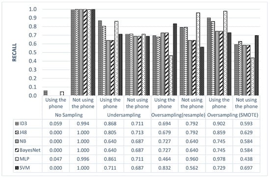 As shown in Figure 6, when no sampling technique was used, the recall values for the minority class (i.e., not using cell phone) were close to zero in all classification models. Using sampling techniques, the recall values were drastically improved. The undersampling technique provided the most balanced recall values for the majority and minority classes. Among the classification techniques applied to the undersampled data, the ID3 and MLP provided the best recall values, with a slight preference for the former method. Although MLP achieved a high recall rate for the no phone-use class on the oversampled data using the resampling technique, the other class (phone-use class) witnessed a considerable drop in the same value. The same observation can be made on the oversampled data using SMOTE, but with the phone-use class having a high recall rate.