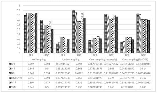 The FPR and ROC values achieved by the classification methods in all scenarios are presented in Figure 7. It is evident that all methods performed poorly in terms of FPR and ROC on the initial data set. The FPR values decrease dramatically after using the sampling techniques. The ROC values also increased considerably for all classification methods. The ID3 was found to be the best classification method in terms of FPR and ROC, followed by the J48 method. The ID3 and J48 achieved their best performances on the undersampled data.