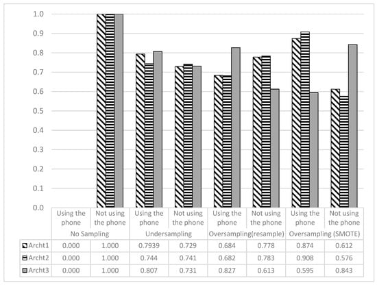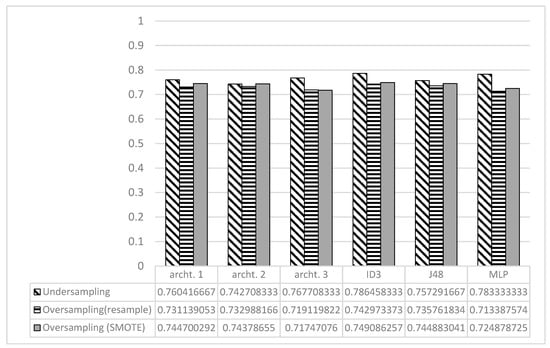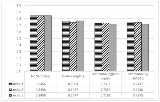 Figure 8 provides a graphical representation of the accuracy achieved by all architectures. Although the highest accuracies were achieved when no sampling techniques were used, the recall values are biased toward the majority class.
