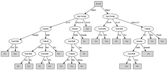 Table 7 shows the rules extracted, and Figure 12 represents the decision tree’s graphical representation. It is worth considering that “Yes” in the leaf nodes means the driver was using his/her cell phone, while “No” means that he/she was not.