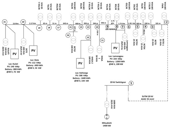 The electricity network under investigation in this study is a 20 kV radial system comprising 21 buses. Each bus is equipped with a 20 kV/400 V distribution transformer to supply the load, as illustrated in Figure 1. The primary source of electricity is a 1400 kW Mitsubishi DG connected to the network. The network has also been supplemented with four photovoltaic (PV) farms and battery systems located in four different locations, namely Lamangau (224 kWp), Kahianga (308 kWp), Dete (112 kWp), and Kulati (140 kWp).