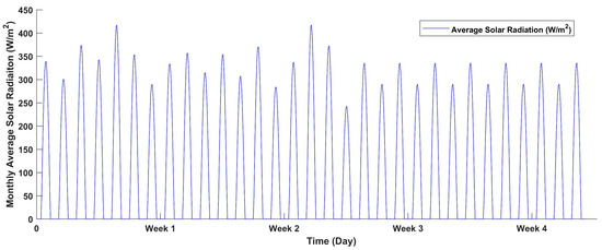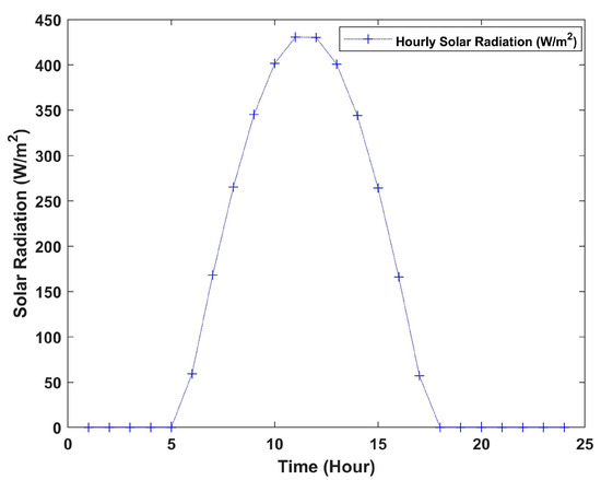 The generated instantaneous power in watts is represented by Ppv (t). The solar cell numbers that were set in Tomia PV farms are denoted by Nm, while ηg represents the PV panel efficiency. The surface area (m2) of a single PV panel is denoted by Am, and Gtill (t) represents the actual value of the hourly global solar irradiance calculated on a tilted surface. Liu and Jordan’s statistical method was used to calculate Gtill (t) [25]. This method is a reliable means of calculating solar radiation values per hour based on Tomia’s daily solar radiation data [26].
