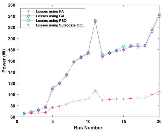 This study provides an optimal solution, considering our investigations and comparisons of the achievements of FA, GA, PSO, and surrogate optimization techniques for optimizing radial power networks while minimizing costs and losses.