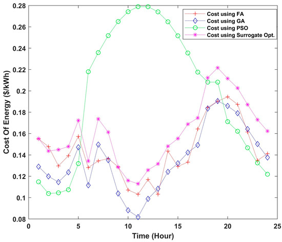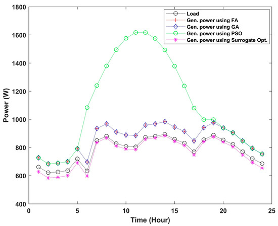 | Hour | Load (Watt) | Firefly Algorithm (FA) | Genetic Algorithm (GA) | Particle Swarm Optimization (PSO) | Surrogate Optimization Algorithm | ||||
