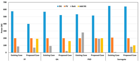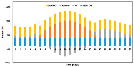 The FBSM was used as a power flow calculation method to determine the active and reactive powers, and sensitivity analysis was considered for the optimum DG location and size [19,20]. In addition, optimization algorithms were utilized to generate the optimum output power from each source at each hour. The obtained results can be used to optimize the system and satisfy the whole island’s demanded power over the entire day [21].
