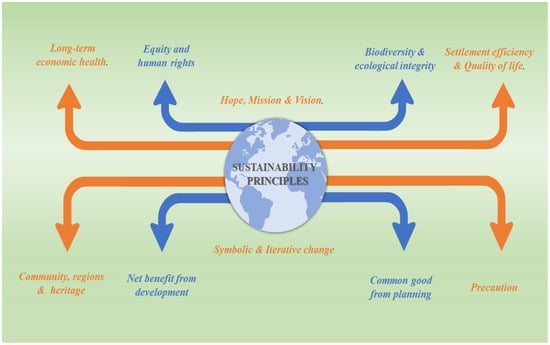 Sustainable development can only be realized if a few principles are followed. However, the economy, environment, and society are typically prioritized when discussing the basics of sustainable development [21]. Population control, human resource management, ecological and biodiversity preservation, production systems, the preservation of progressive culture, and public participation are among the issues addressed [22].