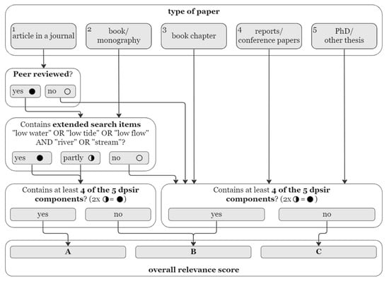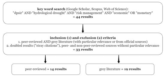 To reflect the research focus described previously, the search terms used are intended to identify existing DPSIR analyses in the topic area of hydrologic droughts that also pay particular attention to economic and risk management aspects. Although relatively few search terms were used, only 44 papers were found in total. The challenge in selecting the search terms was to keep the search query neither too open nor too narrow. This is the main reason why further specifying search terms, such as “low water” OR “low flow” AND “river” OR “stream”, were analyzed only in the later course of the investigation (see Section 3). For a critical reflection of the chosen search terms, see Section 4. Starting from the 44 publications found, the next step was to define inclusion and exclusion criteria to pre-filter the literature relevant to the research questions mentioned in Section 1. Articles irrelevant to the topic and stray citations were then sorted out, resulting in 33 remaining articles. This corresponds to 75 percent. In a final step, a distinction was made between peer-reviewed (n = 14) and grey literature (n = 19), with much of the grey literature being publications by official bodies such as the UN or scientific documents that have not been peer-reviewed but have undergone other review procedures (e.g., master’s and doctoral theses). These remaining 33 sources constitute the research subject for the present study. They were evaluated against the research questions described in Section 1, with a semi-automated content analysis using the Adobe Pro search feature. This includes examination of the individual DPSIR components but also more in-depth analysis using the additional search terms described above. For this purpose, the literature was first categorized according to the scheme shown in Figure 2, scanning the entire text of each publication for the corresponding keywords and topics.