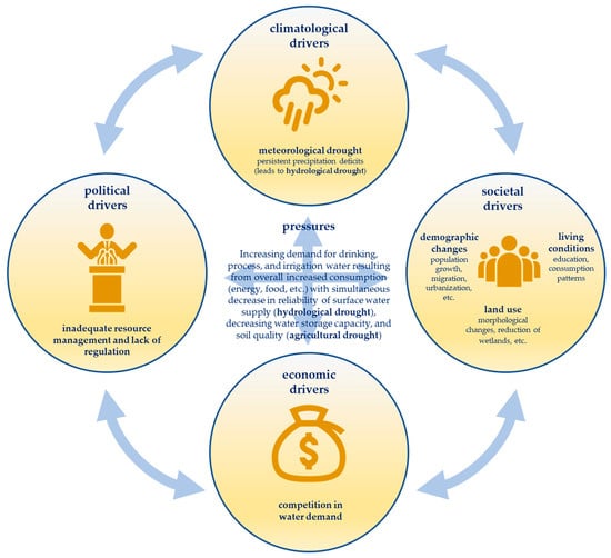 According to the literature, meteorological drought induced by climatological changes is the fundamental driving force of hydrological and agricultural drought [13,36,52], which subsequently are ecosystem pressures. In this context, precipitation deficits (including snowfall) are ultimately only a partial phenomenon that is additionally accompanied by high temperatures, low relative humidity, more hours of sunshine, less cloud cover, and thus increased evaporation [65]. For the United Kingdom, for example, Bryan et al. (2020) [33] note that the risk of water scarcity due to climate change is a key area for action. Water scarcity describes structural stress conditions due to lack or deficiency of water [36], whereas hydrological drought is a temporary phenomenon leading to water shortages. The term water shortage describes the temporary deficit of water supply to meet the demands [36]. Along with the climatological drivers, human activities affect water supply, release, and storage [37]. These must be included as anthropogenic drivers, as they have a direct impact on the spread of different drought types and may even be the main cause of droughts and low-flow events under certain circumstances [48,66,67]. They can be divided into political, social, and economic drivers. All three can affect streamflow and thus water supply, while interacting with each other. Thus, economic development can put pressure on already fragile systems [37,47]. A distinction must be made here as to whether the economy of the particular region is more agricultural or industrial. For agricultural economic structures, water demand is relatively higher than for technology- and knowledge-intensive industries [68] and changing climate will directly affect water supply and demand patterns [55]. In addition to relatively lower water use, water use efficiency is generally higher in industrial areas [35,37]. In absolute terms, however, it must be stated that economic growth overall increases the demand on vulnerable water resources. Wang et al. (2019) [37] showed this with the example of the Heihe River Basin, where economic but also population growth was identified as a driving force. Population growth is also identified as a key driver by Ribbe et al. (2013) [35] in relation to the Mekong region. As a demographic driver, population growth, just like migration and urbanization, affects vulnerability to hydro-meteorological extremes [35,47] and increases consumption-related pressure on global water resources [13,46]. This includes not only public water supply but also the rising demand for irrigation, process, and cooling water [45] due to the growing demand for food, energy, and industrial products [35,37]. In rural areas, but especially in urban areas, the pressure on vulnerable water resources is increasing, as the processes described accumulate more strongly there [56].