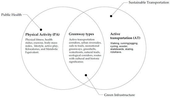 This article revises and significantly extends the work published in the proceedings of the 1st Conference on Future Challenges in Sustainable Urban Planning & Territorial Management [1]. Active transportation (AT) is a form of physical activity [2] that primarily refers to walking and bicycling for commuting purposes (e.g., transporting goods or traveling to destinations) [3]. Greenways are key components of AT and green infrastructure [4]; thus, their multifunctionality contributes to many sustainability and quality-of-life agendas [5,6,7,8,9,10,11] (see Figure 1). For example, between 2008 and 2014, property values of 1747 parcels within 152 m of a 13 km cultural trail in Indianapolis, Indiana, increased by 148%, translating to 1.013 billion USD [12]. These financial returns are substantial, considering the 63 million USD total cost. This cultural trail is an example documented by the Indiana University Public Policy Institute, linking investments in AT infrastructure to the quality of living enhancements and economic prosperity. Other studies worldwide also calculated the cost–benefit analysis of greenways [13,14,15,16]. Therefore, planning to increase the rate of AT (e.g., via greenways) extends beyond mobility, since it contributes to the health, wealth, and sustainability of cities.