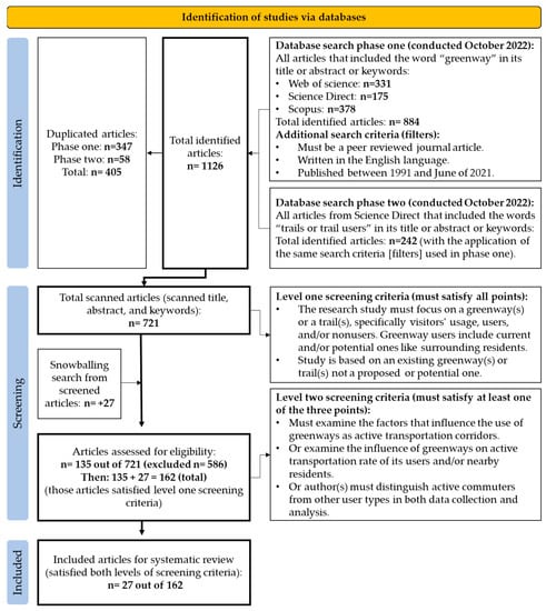 Screening aimed to identify studies that had AT usage of greenways as a part of their data collection and analysis (see Figure 2). Therefore, two levels of screening criteria were used for articles that satisfied the search terms mentioned in Section 2.1. The first screening criteria level included articles that focused on usage and users of greenways. Additionally, the study must be based on an existing greenway, not a proposed or a potential one. Thus, studies that incorporated stakeholders’ preferences on a potential greenway development or plan were not included since it is outside the scope of this systematic review. The same applies to studies that aimed to analyze factors influencing AT usage because they are, in many cases, unfocused on greenways. To clarify, Li and Fan (2020) and Krizek et al. (2007) are two studies that examined the influences on cyclists’ travel route choices [63,64]. Only the latter was included, since it focused on the effect of an urban trail system on cyclists’ travel route choice. Thus, the latter study can be viewed as a subcategory of studies, similar to Li and Fan (2020), which aimed to examine influences on bicycle usage. With that in mind, the authors successfully retrieved all articles sought for screening via the University of Nottingham’s institutional access and library. The extensive first-level screening included 135 out of 721 articles (586 were excluded). With the addition of articles identified via the snowballing method (n = 27), the total became 162 articles.