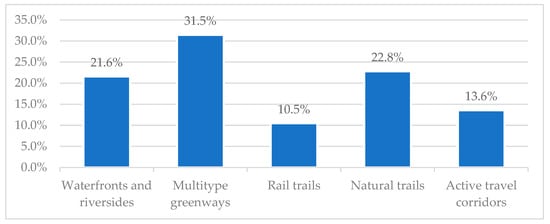 As for the studied greenway types, 31.5% were multitype greenways (see Figure 3). Those studies examined greenways that traverse through multiple settings or studied two or more types of greenways. Additionally, ATCs and rail trails are mostly US-based studies (see Appendix A, Table A1). Synthesis of 27 articles revealed that natural trails were not a greenway type examined by those studies. Such a finding affirms that the transport quality of greenways is likely in (sub)urban contexts.