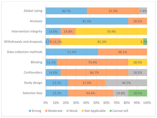 The risk of bias assessment included eight categories (see Table 4). Rating in each category comprised strong, moderate, weak, not applicable, and cannot tell. In addition, a total or global rate was based on the number of weak ratings. If an article had no weak rating in all eight categories, it would receive a “strong” global score, if it had one weak rating, it would receive a “moderate” global rating, and if it had two or more weak ratings, it would receive a “weak” global rating. A limitation of such a tool is that it does not assess qualitative and non-survey methods, analysis, and results. Therefore, the risk of bias assessment for a few articles is incomprehensive and may not be suitable in a few other cases (n = 2).