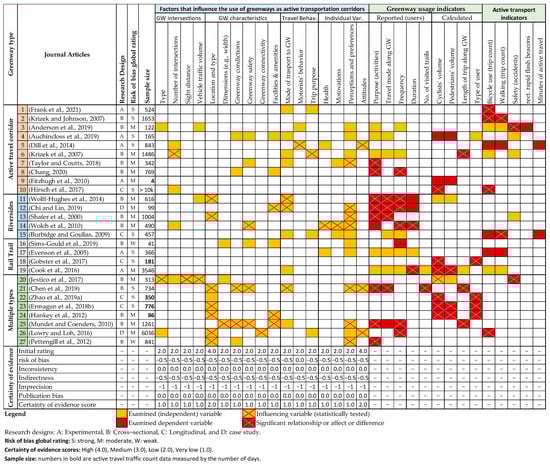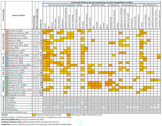 In total, 9 categories and 51 variables were identified as influences on the transportation function of greenways based on the 27 articles. Figure 5 and Figure 6 show which variables were examined most, which were least examined, and which identified variables were statistically found influencing across the 27 articles (p-values ≤ 0.05 levels). They also identify which influences had a significant relationship, effect, or difference with a study’s dependent variables (e.g., use purpose). Despite the minor overlap between the 27 articles in the examined variables, no study parameters were replicated in different contexts, and none considered all variables (potential endogeneity problems). These differences reflect the variations in study goals, methods, data availability, location, greenway type, authors’ specialization, budgets, and more. Nonetheless, establishing standardized research protocols to examine the influences on greenways usage for transportation is needed for a more effective synthesis of effect measures. The certainty of evidence assessment for each influencing factor is also part of Figure 5 and Figure 6. Adding the research design, global rating for the risk of bias, and sample size to these figures facilitated the assessment process. While referencing Figure 5 and Figure 6, the narrative synthesis in Section 4.1, Section 4.2, Section 4.3, Section 4.4 and Section 4.5 identifies patterns, inconsistencies, gaps, and direction of association. Section 4.6 provides a summary of those findings as well as an interpretation of the certainty of evidence assessment results.