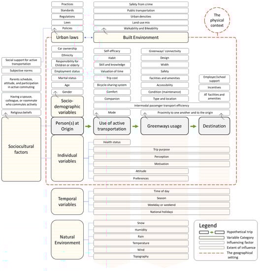 Influencing factors were divided into socioeconomic and demographic influences, weather and temporal influences, environmental and accessibility influences, influences of greenway characteristics, and travel behavior and individual influences. Each variable category had multiple factors influencing the transportation function of greenways. The arrival of such an analysis framework resulted from synthesizing the identified greenway use forms and the factors influencing their usage as ATCs across the 27 articles. Simultaneously, the classification of influences (i.e., variable categories) was influenced by the literature review of Senes et al. [22].