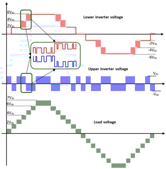 - Kaliamoorthy, M.; Rajasekaran, V.; Christopher Raj, I.G.; Hubert Tony Raj, L. Generalised hybrid switching topology for a single-phase Modular Multilevel Inverter. IET Power Electron. 2014, 7, 2472–2485. [Google Scholar] [CrossRef]
