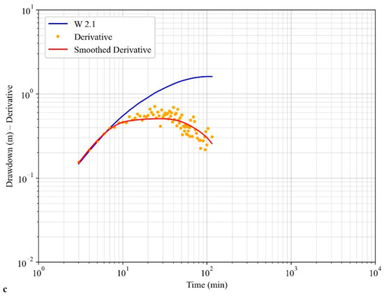 The semi-log plot of drawdown–time shows that for the pumping well and the W5.1 observation well a similar trend up to approximately 2000 min with an increase in the slope after the first hundred minutes is observed (Figure 7a). The drawdown curve of the observation well W5.2 also shows a similar trend in the early time, even if the measured data are less frequent (Figure 7a). In the latter case, the drawdown is higher than that of W5.1, despite the fact that the distance from the pumping well is comparable (Figure 6a).