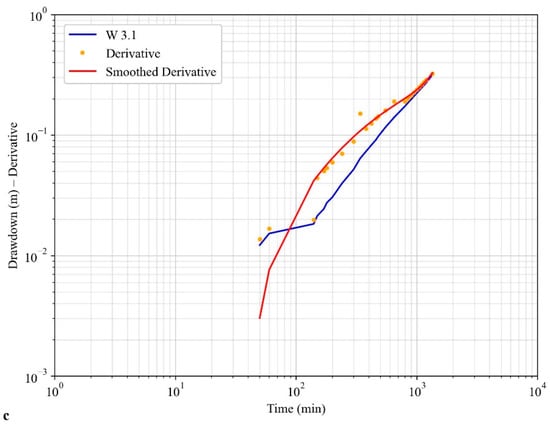 W3 test: (a) semi-log plot of drawdown–time in pumping well (W3) and observation well (W3.1); (b) bi-log plot of drawdown, derivative and smoothed derivative in pumping well (W3); and (c) bi-log plot of drawdown, derivative and smoothed derivative in observation well (W3.1).