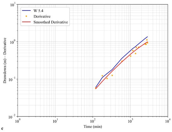 W6 test: (a) semi-log plot of drawdown–time in pumping well (W6) and observation well (W5.4); (b) bi-log plot of drawdown, derivative and smoothed derivative in pumping well (W6); and (c) bi-log plot of drawdown, derivative and smoothed derivative in observation well (W5.4).