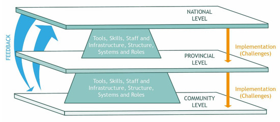 We added three levels of governance to the framework to reflect the need for adequate capacity of different types at each level of governance in order to ensure that the next governance level is effective in delivering desirable outcomes. For example, national government agencies make monetary decisions, develop policy frameworks, and allocate financial resources to provincial offices for policy implementation (systems capacity). However, if (a) there are not enough officers (low workload capacity) with the necessary skills and expertise (low personal capacity), (b) existing performance management (monitoring and evaluation) mechanisms are weak (low supervisory capacity), or (c) the necessary tools (e.g., software, the Internet) are not available (low performance capacity), then there will be a significant delay in the flow of information and resources (low systems capacity).