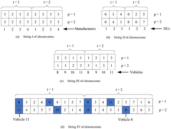 The third string (Figure 1c) represents the allocation of vehicles to DCs. Each gene represents the number of the DC, and the gene values are filled randomly with the number of vehicles. DCs that are not in operation are assigned the value zero. In Figure 1c, for Perishable 1 in Period 1, Vehicle 8 is allocated to DC 2, and Vehicle 9 is allocated to DC 3.