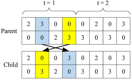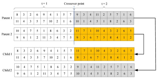 - Single-point crossover is employed in this study. Specifically, crossovers are applied to String II of the chromosome. Following the approach proposed by Hiassat et al. [28], the crossover points are selected from a valid crossover set, which consists of boundary points between each period.