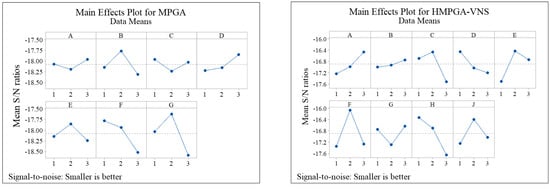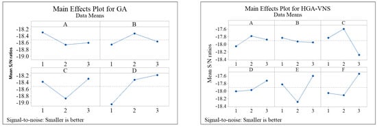 The S/N ratio output is analyzed by Minitab software to identify the optimal levels for each algorithm, as illustrated in Figure 4. The larger values of the S/N ratio indicate more robust algorithms, and these levels are considered as the optimal ones. For GA, the optimal levels are 1, 2, 3, and 3 for the respective parameters.
