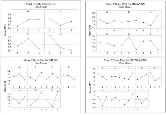 Mean RPD plot for each level of the factors (factors represented by capitalized letter in each subfigure are consistent with Table 4).