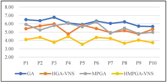 Figure 6 displays the inverse relationship between the algorithm’s capability and the size of the 10 problems considered. Each point presented in Figure 6 represents the means obtained using some algorithm from replicate experiments of the corresponding instances size described above. The best-performing algorithms are expected to exhibit consistently lower values with higher capacities. The graph highlights the outstanding performance of the HMPGA-VNS algorithm, which outperforms the other algorithms in the entire series.