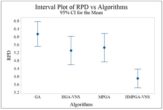 Furthermore, the performance of the various algorithms is further compared by analyzing the variance of the mean RPD of each algorithm for instances of different problem sizes. The analysis of variance (ANOVA) is utilized to obtain the means and least significant difference (LSD) intervals with a confidence level of 95% for each algorithm, as depicted in Figure 7. The statistical analysis indicates a significant difference in performance between HMPGA-VNS and all other algorithms. Remarkably, HMPGA-VNS outperforms all other algorithms, while the performance of the other algorithms, in terms of mean RPD, does not exhibit any significant difference.