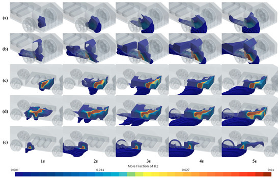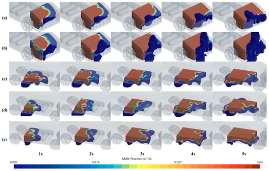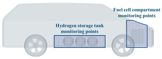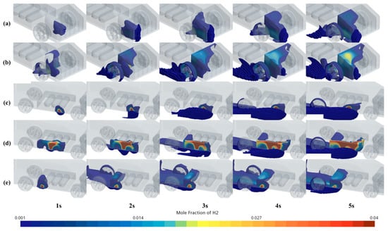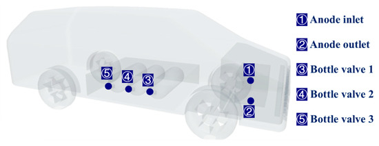 - Li, Y.; Hou, X.; Wang, C.; Wang, Q.; Qi, W.; Li, J.; Zhang, X. Modeling and analysis of hydrogen diffusion in an enclosed fuel cell vehicle with obstacles. Int. J. Hydrogen Energy 2022, 47, 5745–5756. [Google Scholar] [CrossRef]