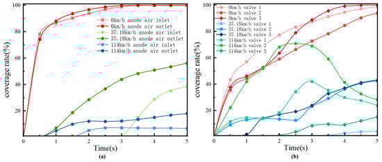 - The longitudinal wind prolongs the diffusion time of hydrogen to the headspace, and the coverage area of hydrogen in the headspace decreases. After five seconds of leakage, the average coverage rate reached 98.58% in windless conditions, only 36.92% at 37.18 km/h, and even decreased to 18.38% at 114 km/h, with a decrease of 81.35%.