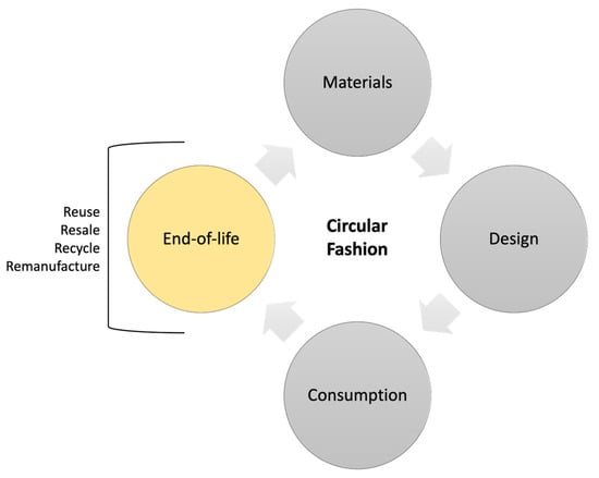 The conceptual framework of the circular fashion system discussed herein draws from the insights presented in the study “Towards Circular Economy in Fashion: Review of Strategies, Barriers, and Enablers” by Dissanayake and Weerasinghe [7]. This research, which underscores the importance of reuse and remanufacturing, significantly aligns with the focus of our study and places it clearly within the circular fashion system (Figure 1).