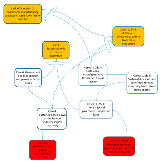 The lack of education on sustainable manufacturing practices emerged across the data set (all cases) as the South African consumer is not fully aware of the need for sustainability. One of the cases even suggested teaching platforms such as workshops in schools and community projects. In the literature, Hamzaoui et al. [27], Mastamet-Mason et al. [35], and Hira et al. [36] noted the lack of education and awareness among South African local consumers regarding environmental concerns resulting from unsustainable fashion practices.