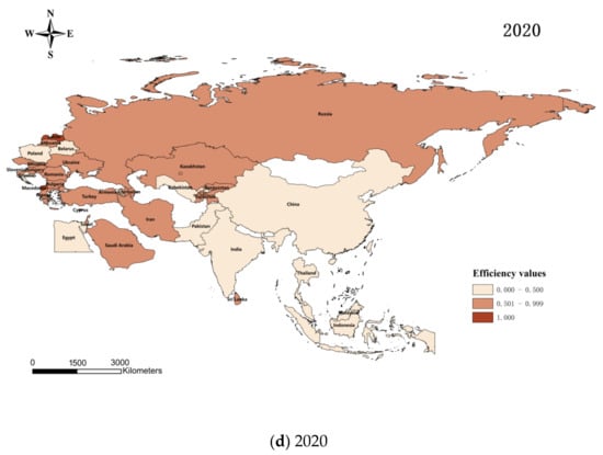 Figure 1. From the figure, we can see the regional differences of agricultural carbon emission efficiency of each country: from 1995 to 2020. The figure shows that regions with higher efficiency of agricultural carbon emissions are less and less every year from 1995 to 2020. It can be seen that the development of low-carbon agriculture in each country lags relatively during the 25 years, and the agricultural carbon emissions increase relatively with the same level of inputs and agricultural economic output, which reflects the incongruous development of agricultural production and environmental protection in each country. The reason may be that the countries along the route of the Belt and Road Initiative have experienced rapid economic development and agricultural production growth in the past decades. With the expansion of agriculture and increased production activities, agricultural carbon emissions may have increased accordingly. Especially in some emerging economies and developing countries, the growth in agricultural production may decrease carbon emission efficiency.