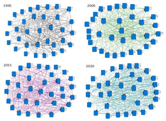 Using the above measured agricultural carbon emission efficiency as the base data for constructing the spatial correlation matrix, the spatial correlation binarization matrix (GL) of agricultural carbon emission efficiency of 34 countries along the route of the Belt and Road Initiative is constructed by combining the results obtained from Equation (1). Then the social network analysis tool UCINET 6 software is applied to produce the spatial network topology map of agricultural carbon emission efficiency of 34 countries along the route of the Belt and Road Initiative. Four years, 1995, 2005, 2015, and 2020, were selected as representatives of the study for image presentation, as shown in