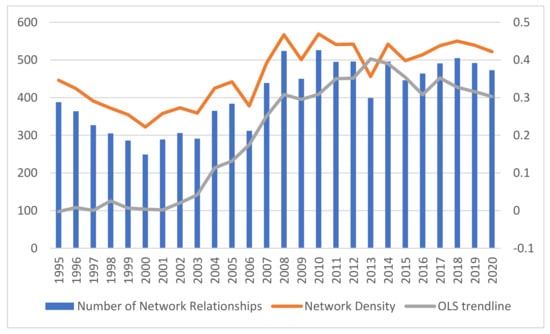 Figure 3, the number of network relationships of the spatially linked network of agricultural carbon emission efficiency in 34 countries along the route of the Belt and Road Initiative shows a fluctuating upward trend, from 388 in 1995 to 473 in 2000, for an overall long-term increase of 21.91%, of which the highest value was 526 in 2010. Network density also shows a fluctuating upward trend, increasing from 0.346 to 0.422, for an overall long-term increase of 21.97%, of which the highest value was 0.469. Moreover, adding the OSL trend line in the figure, it can be seen that the smooth OSL trend line rises from 2001 to 2013, after which the marginal gain strongly decreases, and the rate of increase in the trend line slows down, which indicates that the agricultural carbon emission efficiency is gradually stabilizing. The spatial correlation network of agricultural carbon emission efficiency is gradually converging to a balanced state, and the variability is gradually decreasing. It can be seen that the spatial correlation network of agricultural carbon emission efficiency among countries has increased in intensity and strengthened the interaction among countries in the past 25 years. On the other hand, the opening of China-European trains and the promotion of the Belt and Road Initiative have provided support and impetus for the diffusion of agricultural technologies and the flow of agricultural factors among countries and provided a guarantee for the formation of the spatial correlation of agricultural carbon emission efficiency.