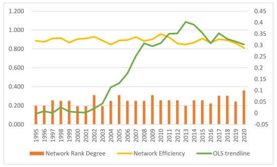 Figure 1. Rapid economic development and growth in agricultural production lead to increased agricultural carbon emissions in some countries, thus reducing agricultural carbon efficiency. The network hierarchy rose from 0.198 in 1995 to 0.360 in 2000, for an increase of 82.38% over the past 25 years, with the lowest values being 0.194 in 2000, 2001, and 2003, indicating that the rigid hierarchical structure within the spatially linked network of countries’ agricultural carbon emission efficiency still exists, which may be influenced by the level of economic development of each country. Countries with high levels of economic development are likely to invest more resources in technological innovation and environmental protection, thus improving the efficiency of agricultural carbon emissions. Conversely, countries with low levels of economic development may face resource constraints and technological backwardness, resulting in relatively low efficiency of agricultural carbon emissions. At the same time, some countries may have abundant natural resources and agricultural infrastructure, enabling them to use resources more efficiently and increase carbon emission efficiency, while other countries may not be able to achieve the same level of efficiency due to scarce resources or lack of proper investment, thus leading to a specific gap in agricultural carbon emission efficiency across countries. This is also consistent with the results of the agricultural carbon emission efficiency measurement above.