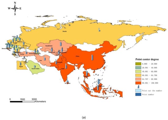 Figure 5a, the point degree centrality of 15 countries, including Pakistan, Kazakhstan, Kyrgyzstan, Croatia, and Malaysia, is higher than the mean value, indicating that these countries are closer to the center of the network and have more connections and relationships with other nodal countries that play a crucial role in the formation and stable development of the overall network of agricultural carbon emission efficiency. They play an essential role in the construction and steady growth of the comprehensive network of agricultural carbon efficiency. As key players in information dissemination, resource exchange, or decision-making, these countries play a crucial role as bridges, connecting different sub-networks or groups. At the same time, as important hubs for information exchange and resource flow, they facilitate connections and cooperation among other parts of the network. Moreover, most countries above the mean are concentrated in South and Southeast Asia. These countries can enhance economic cooperation, connectivity, cross-border investment, and political cooperation in the region through the Belt and Road Initiative to achieve mutual benefits in economic development, reduce dependence on Western markets, and promote stability and prosperity in each country, thus improving their agricultural carbon emission efficiency. The histogram in