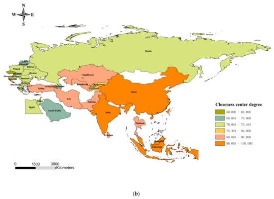 Figure 5b shows that 15 countries, such as Sri Lanka, Tajikistan, Thailand, Turkey, and Uzbekistan, exceed the mean value. Most countries above the mean are concentrated in South and Southeast Asia, consistent with the results above. It indicates that these countries are more likely to be spatially connected with other countries, and the elements of agricultural carbon emission efficiency move quickly, which significantly contributes to the improvement of agricultural carbon emission efficiency in other countries. Six countries, such as Israel, Cyprus, and the Czech Republic, which are more challenging to link with spatial networks due to their low proximity to the center, do not have access to resources comparable to countries with high proximity to the center and need to find other opportunities to promote domestic agricultural economy and development and thus improve their agricultural carbon emission efficiency.