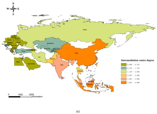 Figure 5c shows that the intermediation centrality of each country is uneven and has unbalanced characteristics, and a considerable number of agricultural carbon emission efficiency linkages are accomplished through economically developed countries such as China, India, and Indonesia.