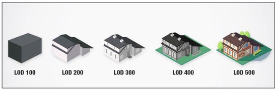 The concept of level of detail (LOD) refers to setting the standards and level of detail for BIM model elements from the design phase of the project to the construction phase. LOD levels contain information about the project, graphical data, and non-graphical data. Thus, it contributes to improving the level of communication among BIM users and ensuring consistency in application [,,,]. LOD is a reference corresponding elementarily to the questions of the project stakeholders about BIM. The geometric information content of the building components is apprehended through LOD levels and is a way for disciplines to convey their provisions to each other. The main reason for applying the LOD concept is to clarify how the information will progress and deliver higher quality and competent projects by alleviating complexities. The LOD100 refers to the preliminary design universe. The model element can be represented graphically by a symbol or general representation whereas the LOD300, LOD400, and LOD500 levels derive from capturing data into the model Figure 1 [,,,,]. It is also feasible to conduct more in-depth studies using the LOD250 and LOD350 levels depending on the conditions [,,,].