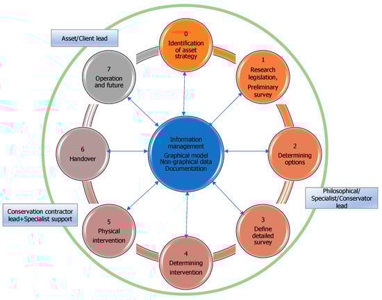 H-BIM technologies are tools using point clouds to create BIM geometry while modeling historical buildings. These technologies utilize information from laser scanning devices or photogrammetry [,,,,]. H-BIM enables the management of historical building geometry and, in particular, the planning of the restoration process. Working in the H-BIM environment aims to build more complex models from 2D drawings [,,,,]. The H-BIM approach manages building attraction and deterioration data or information analysis to sustain material and structure characterization and protection response measures in diverse scenarios [,,]. From the standpoint of building conservancy, the H-BIM model may exclusively be regarded as a building catalog, assisting in determining affordable and reasonable maintenance and keeping track of the potential modifications over time. For instance, it serves as a database that enables suitable restoration and replacement in case of an earthquake event or artificially caused (human-driven) demolition [,,]. There has been substantial progress in proper conservation, restoration, and reconstruction procedures for historical heritage, thanks to the numerous advantages H-BIM offers [,,]. Historic England published the bulletin of ‘BIM for Heritage’ to guide the development of the H-BIM methodology in 2017. Additionally, it proposed a lifecycle policy for H-BIM implementations depicted in Figure 2 [,,,].