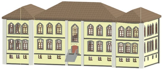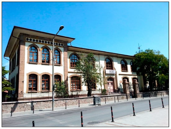 The historical education building constructed in 1929 is still active for educational purposes in Konya. The school building consists of a basement and two floors. Smooth-cut stone was used in its construction, and it was built with the masonry technique. The first-floor windows are round and the second-floor windows are pointed arches. Figure 3 displays the location map of the school building, which serves as the study area, and Figure 4 illustrates a current photograph of the building exterior (outside).