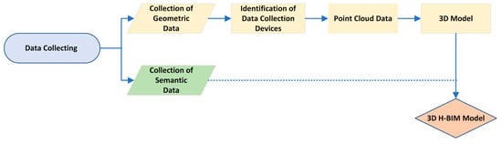After the decision-making process on the study area and the relevant geometric data collection technique, the initial process begins with compiling information on graphical, semantic, morphological, and typological data within the scope of H-BIM. Utilizing 3D laser scanning and photogrammetry techniques is the method for gathering graphic data. Object surfaces scanned by these technologies are transferred to the geometric plane using point clouds; however, the semantic, morphological, and typological information is accessed through textual and historical sources. This information provides details about the materials and construction techniques of the building, its architectural features, and the transformations it has undergone from the past to the present [,,]. The utilization of all gathered data in a database constitutes the foundation of the second stage of the study methodology. Preferentially, the generated point clouds are modeled best parametrically using automatic or manual techniques. The auto method derives from automatic segmentation and parametric-object creation by point clouds via utilizing specific algorithms and software plugins available for level surfaces or primitive geometries. However, the manual method involves directly integrating filtered point clouds into BIM environments to generate objects [,].