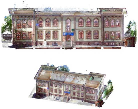 The building data were transferred to the Revit application using Autodesk Recap 2022 software, point cloud processing, and management software, as well as file conversion in the ‘.rcp’ format (.rcp or .rcs). The 3D point cloud data of the building, used as the study material, were imported into the software. Figure 6 displays the visuals of the 3D point cloud.