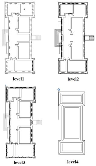 The study focused on creating the level plans via utilizing the point cloud based on the attic and floor walls of the building’s existing floors. Each of the building’s floor plans refers to a level. Accordingly, level 1, level 2, level 3, and level 4 represent the ground floor, first floor, second floor, and attic, respectively. The level plans for each floor’s height were entered using the previously constructed level plans. Identifying the level plans is the initial step of the modeling process. Drawing the walls and designating the placements of items like doors and windows within and outside the building, within the range of detail levels, concludes the modeling at the LOD 200 level after setting the level measurements. Figure 7 displays the overview of the level plans (floor plans) created upon the project’s conclusion.